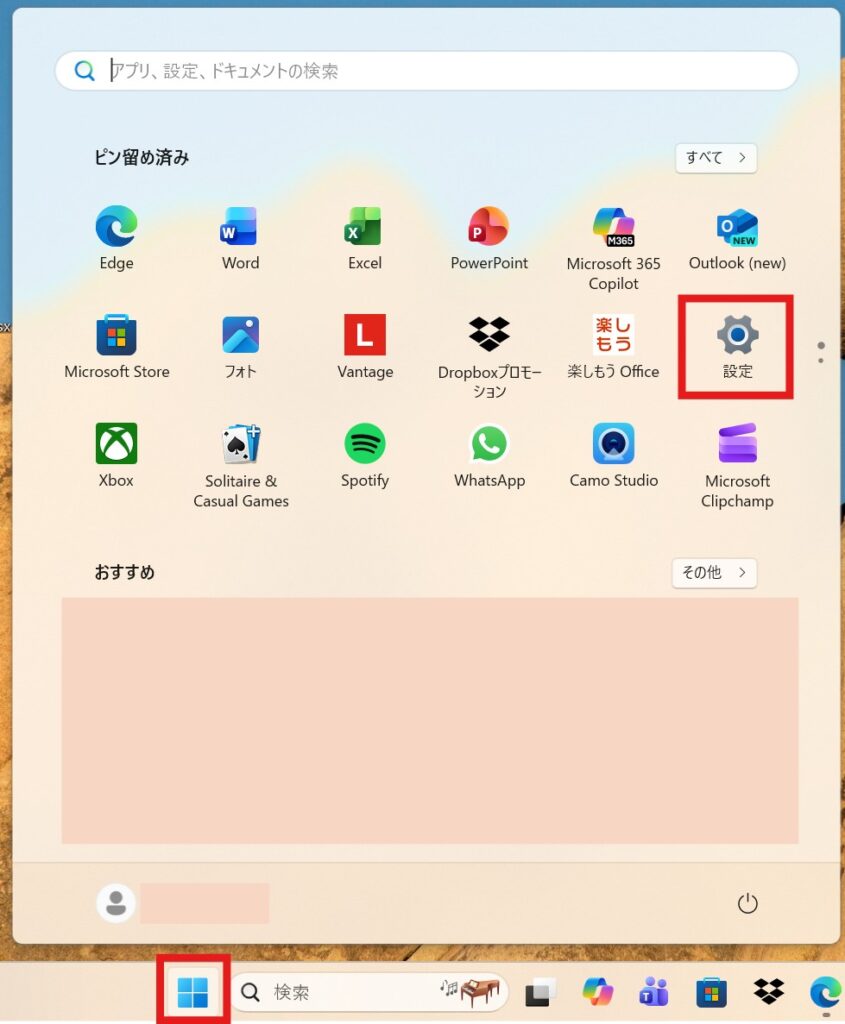 1.「スタート」ボタンを押して、「設定」をクリック。