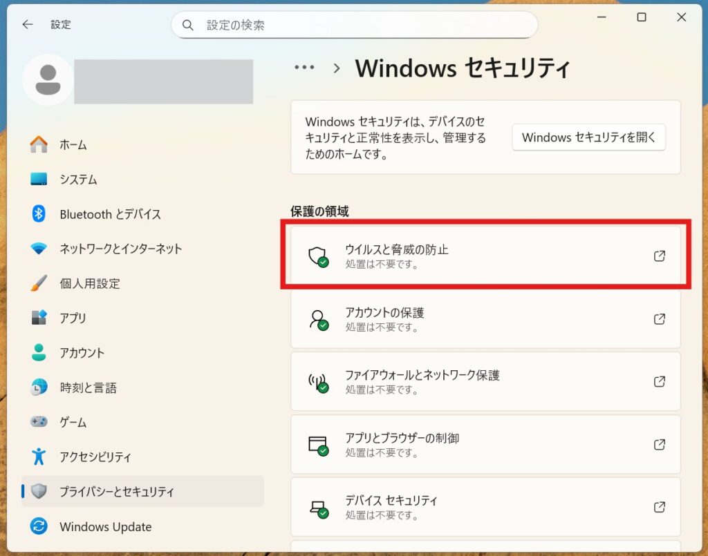 3.「ウイルスと驚異の防止」をクリック。