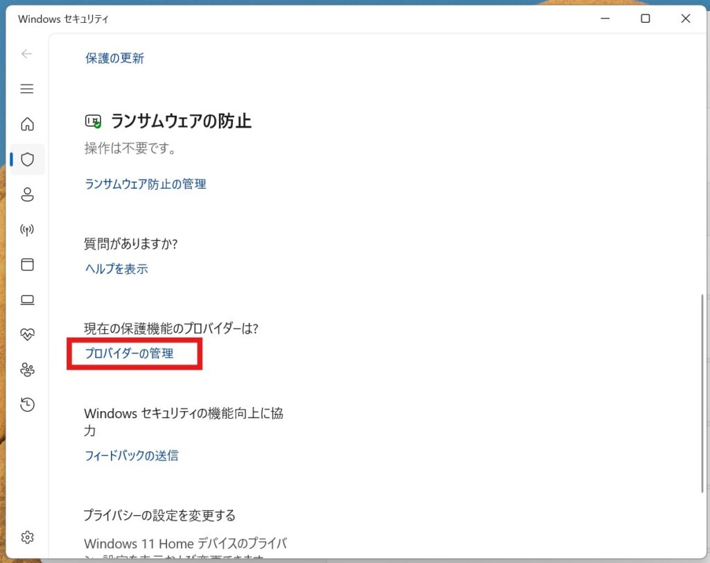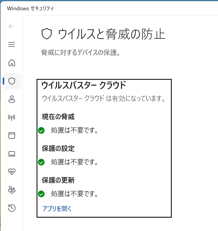 当記事で紹介した「現在入っているウイルス対策ソフトの確認方法」で、ソフトを再確認。3.「ウイルスと驚異の防止」をクリックした時点で、以下のように表示されました。