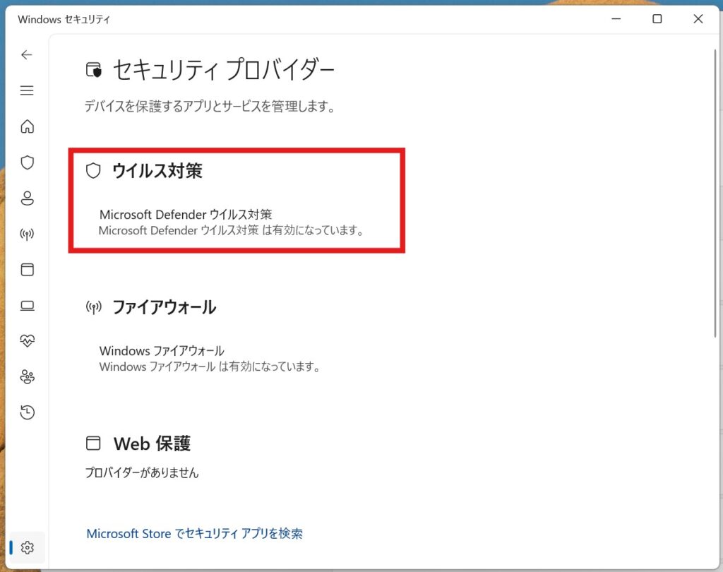 5.ここでやっと現在入っているウイルス対策ソフトが確認できます!私は現在は標準搭載のMicrosoft Defenderしか入っていないので、以下のように表示されました。