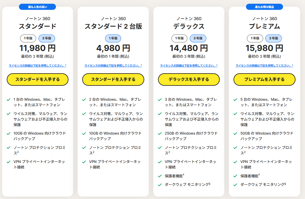 ノートンの製品展開と機能は以下の通り。