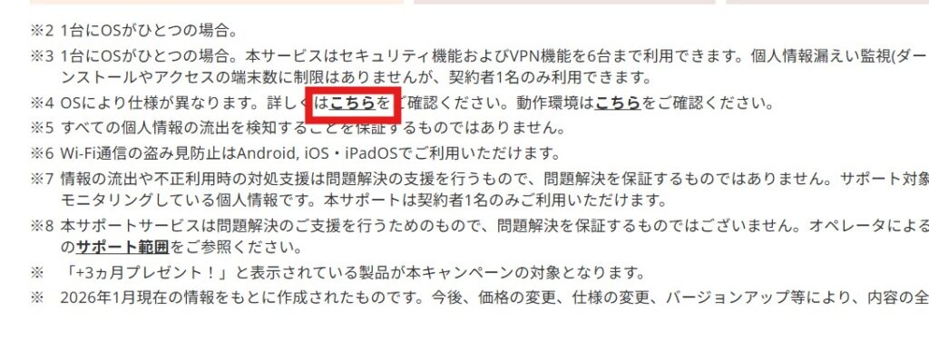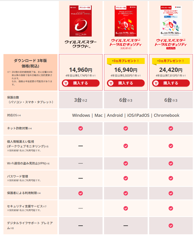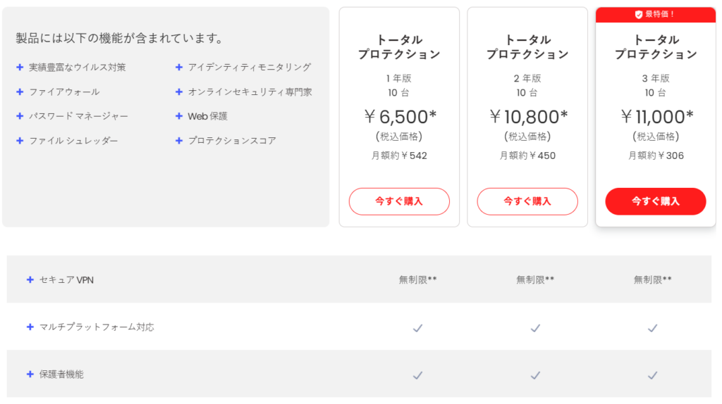 ウイルスバスターは一番安いプランから複数のデバイスを保護できるようですね。注意していただきたいのが、Wi-Fi通信の盗み見防止(VPN)機能はWindowsでは利用できないようです。あと値段がお高いイメージがありますね。その他情報は以下の通り。