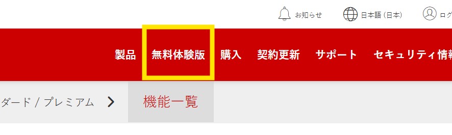 そしてウイルスバスターにも無料体験版がありました!こちらも「ウイルスバスター」と打って最初に出てくるページには無料体験版はないのですが、以下の通りにたどれば無料体験版にたどり着きます。