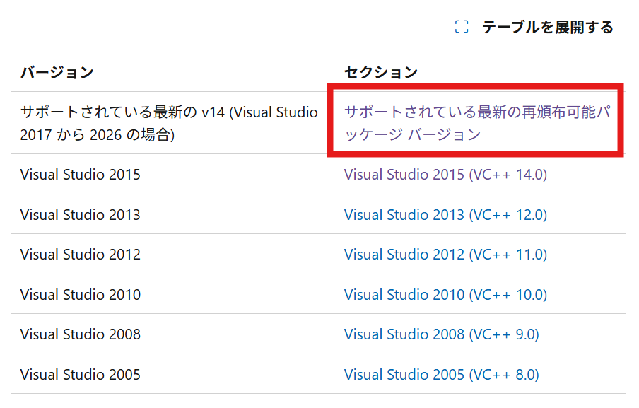 ↑Microsoftの公式サイトの、VC++の再頒布可能パッケージをダウンロードできるページへ行きます。